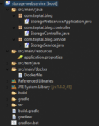 Our application composition is simple. We have a Spring Boot application entry point in our StorageWebserviceApplication.java file. The logic for uploading and downloading files is in StorageService.java. StorageController.java is a Rest controller, containing API endpoints used for file upload and download. Here is the project hierarchy: