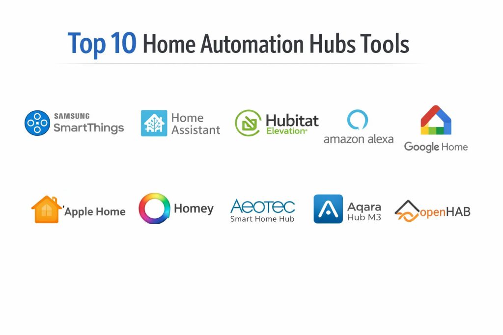 • Selected widely recognized hubs and platforms used in real homes and smart home communities.