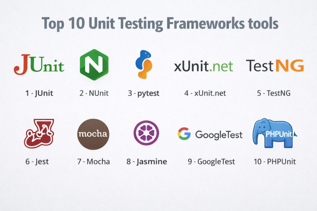 Unit testing frameworks help developers verify the smallest pieces of code (functions, methods, classes) in isolation. In simple terms, they give you a consistent way to write tests, run them automatically, and see clear pass or fail results. When unit tests are reliable, teams ship faster because they catch bugs early, reduce risky changes, and make refactoring safer.